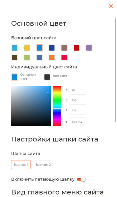 В нём можно выбрать цвет шаблона, варианты шапки сайта, горизонтальное или вертикальное расположение главного меню, включить/отключить блоки на главной странице.
